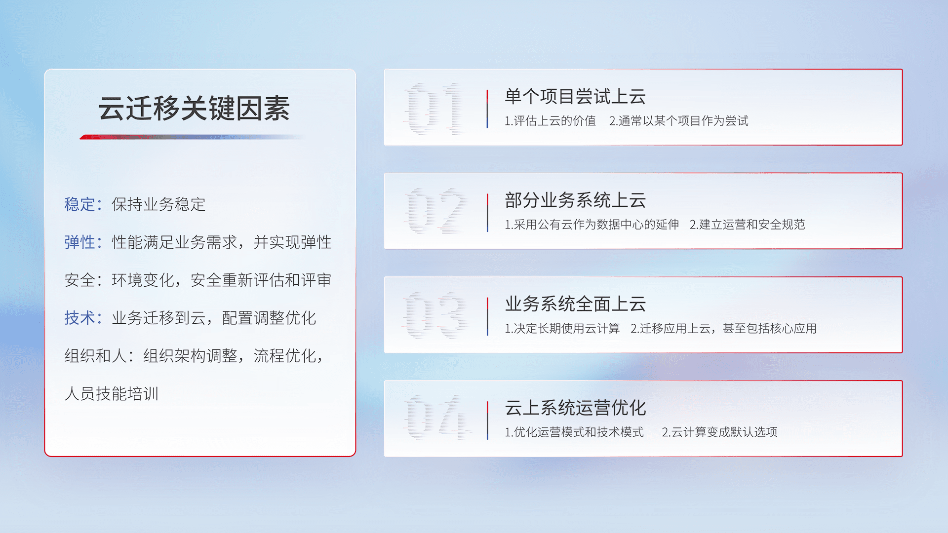 结合实际业务,,,,从规划设计、、云平台选型、、、、云原生改造、、数据迁移、、集成交付,,,迁移全过程为客户识别最佳上云路径,,做好风险识别管理,,,设计网络架构、、身份权限、、安全审计合规、、、、操作审计、、、日志审计、、、、监控告警策略、、、多站点容灾设计等,,对云上基础设施进行整体规划,,提升IT治理水平,,,,以满足弹性、、、、高可用、、、高性能的需求。。。