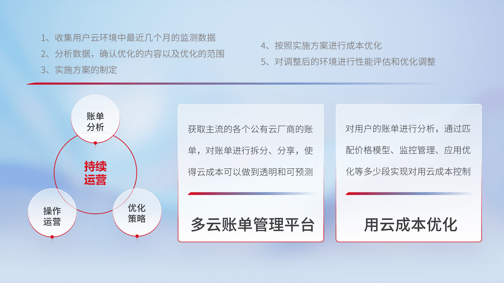 通过多云纳管,,,以统一的资源数据模型把客户的云资源进行抽象和封装,,,进而实现对多云资源的统一操作,,,,保障云资源管理的可靠性、、稳定性与可用性。。。。量身定制化运维内容,,,配置、、、、开发运维、、、、补丁管理、、备份、、监控、、、、认证和访问管理、、审计和日常巡检等,,保障在用云过程中的可靠度,,,,稳定度以及高可用率。。。